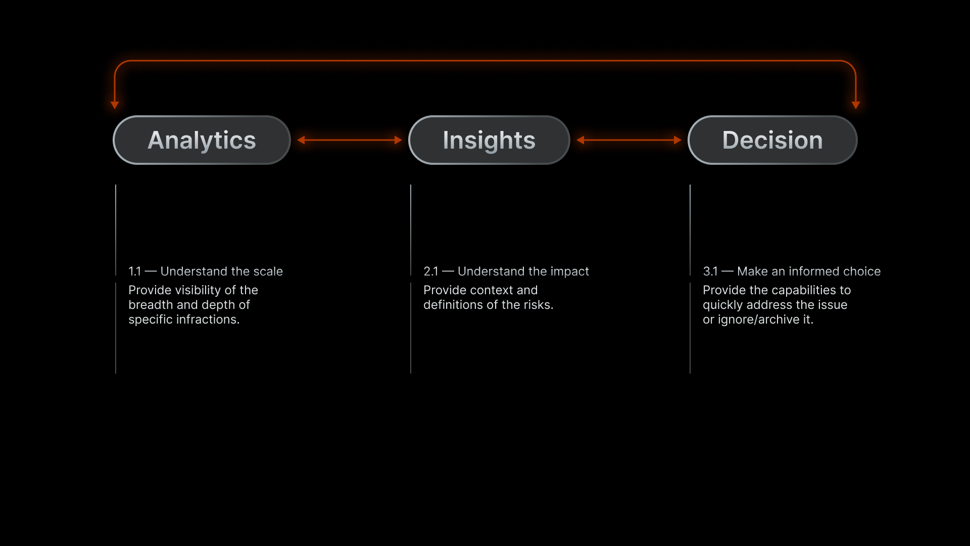 Through this understanding, I established that the customer journey is a cycle between: Viewing analytics, understanding the risks and insights, and finally taking a decision to either ignore or quickly mitigate the risk.