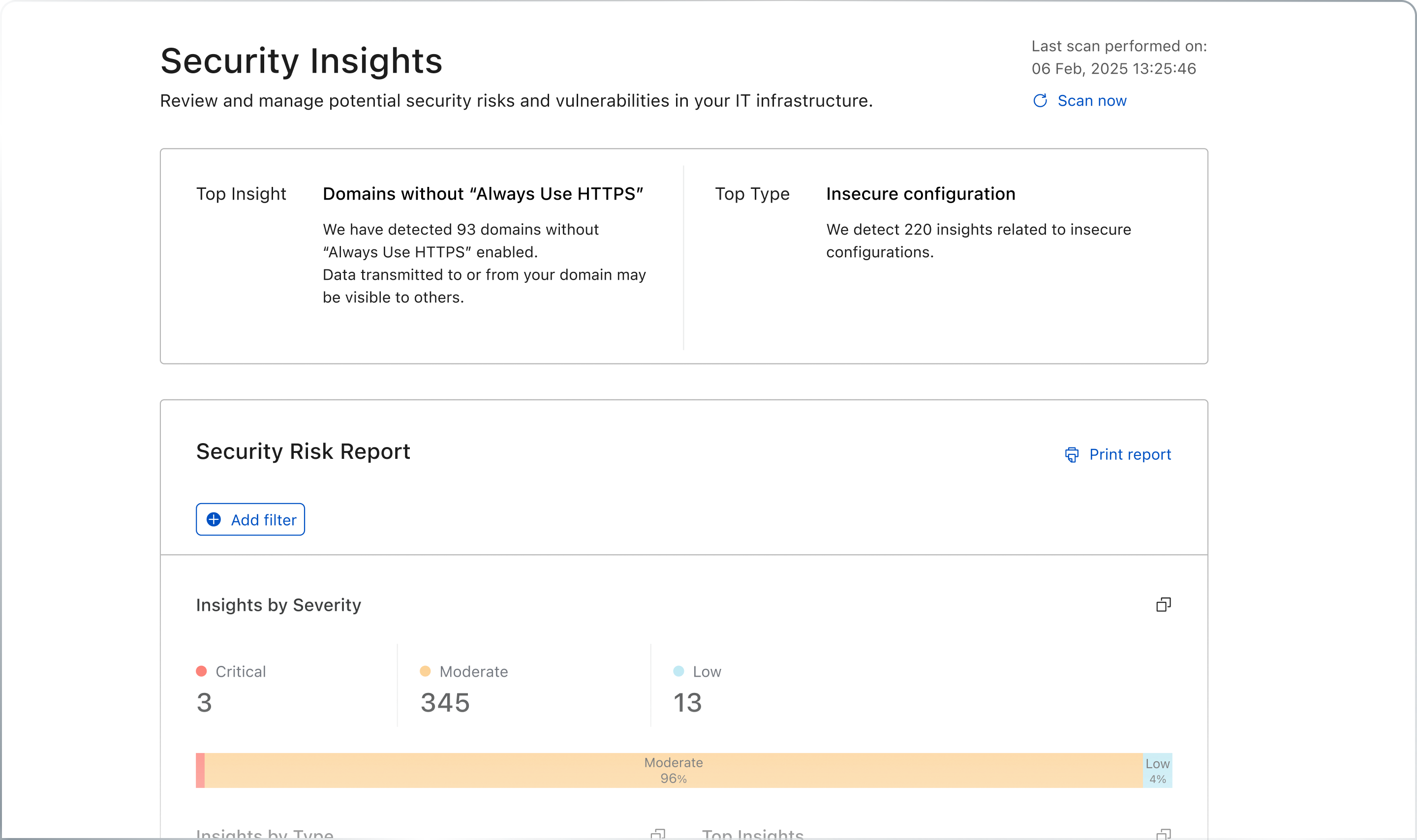 We wanted to get the reaction from customers about specific information that was under consideration to include for the feature. The task here was the validate the information, not how it was being displayed, nor any of the associated interactions. As such, rather than potentially distract the customers during the conversation with UI, we instead shared specific, detailed figures, similar to that which we would be able to share within the product, in a presentation/Slides format. The report generated for each customer highlighted various discovered vulnerabilities within their infrastructure.