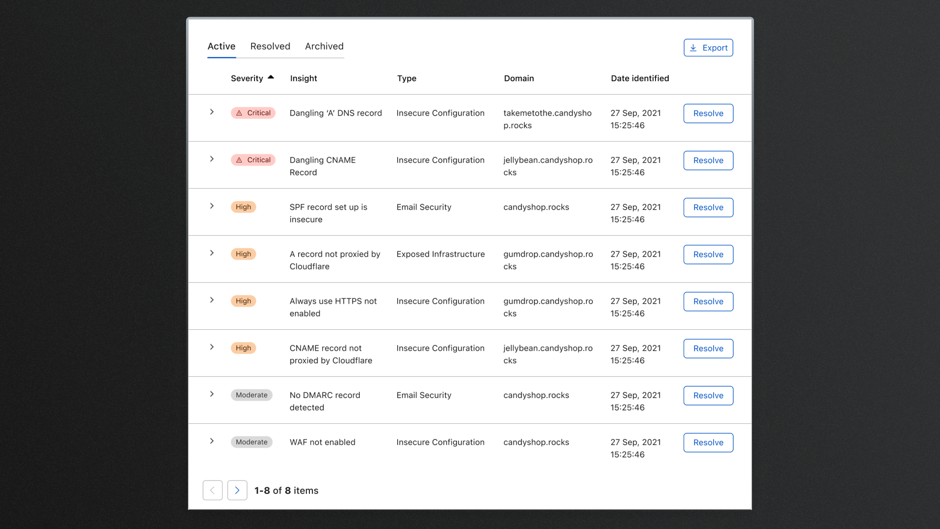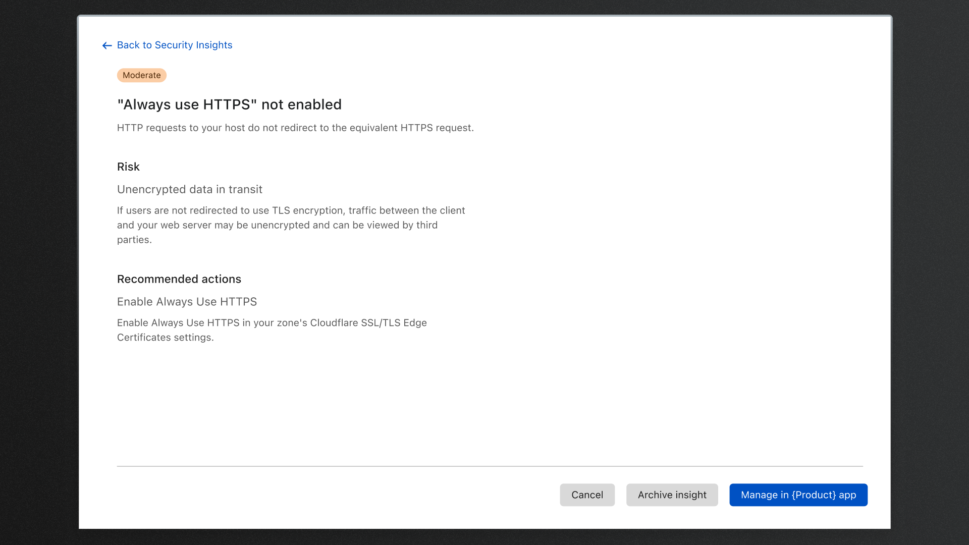 Some users were not familiar navigating through the Cloudflare Dashboard and they wanted a straightforward way of mitigating the risk. Making what's complex, simple, has always been a goal of when whatever feature I'm designing. Where possible, we included a single click, resolution workflow. Here, users would be able to read a summary of the risk and either take action on it, or archive the issue. Alternatively, if we wouldn't manage the issue from this page, we would help the user navigate to the correct page within the dashboard.
